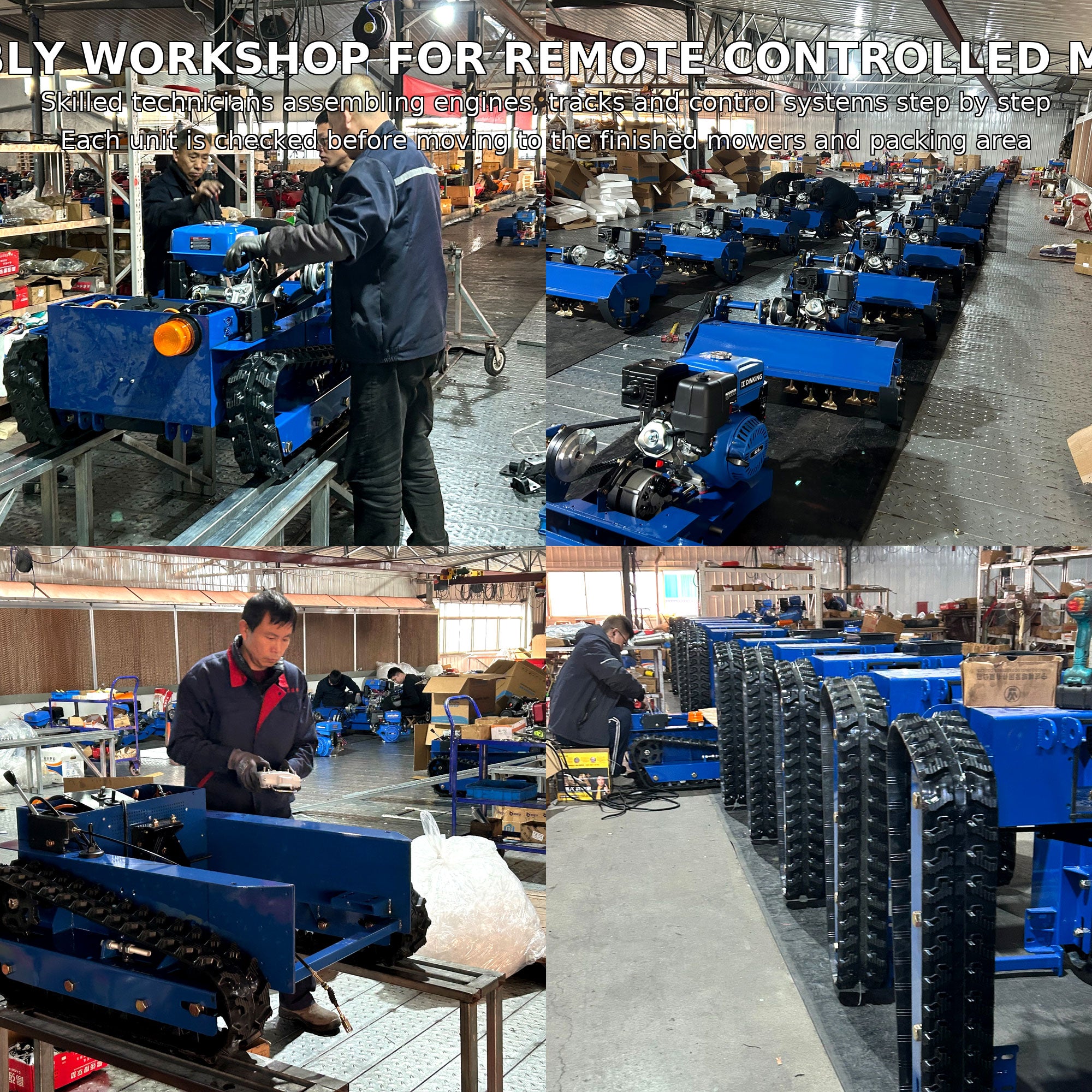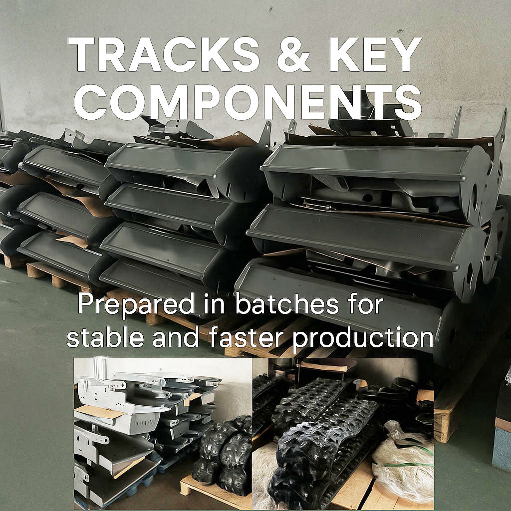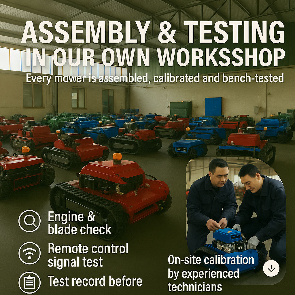 Heavy-duty rubber tracks, blades, rollers and gearboxes are prepared in advance. This keeps our remote-controlled mowers stable in quality and reduces lead time for new orders.